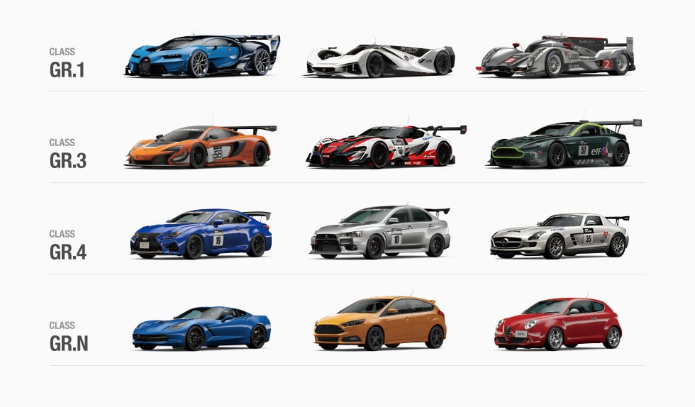 Gran Turismo Sport takes on a new approach. Unlike their usual car designs, their cars have a more Indy 500 theme to them. Among the cars, there are four different classes: GT 1 to GT4. However, not all the cars are factual cars. Some of the cars added into the game are purely car concepts from the game developers.
