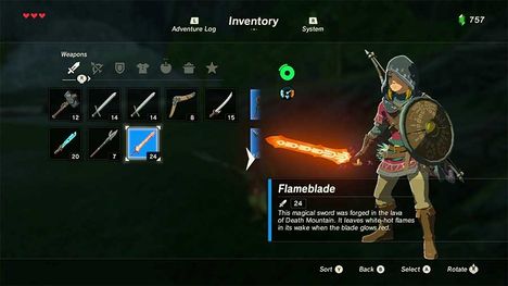 The Flameblade is a valued weapon in the Legend of Zelda: Breath of the Wild. This weapon not only has fire attribute but has a variety of utilities. One utility is that it can detonate bombs. Another is that it can light fires which allow you to convert your normal arrows into fire arrows. This magical sword was forged in the lava of Death Mountain. It leaves white hot flames in its wake when the blade glows red.