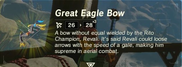 The Great Eagle Bow is a ranged weapon in Breath of the Wild. Its bearer, Revali, the Rito Champion once wielded this bow. this has earned him recognition as a veteran on aerial encounters as it allowed the champion to fire arrows at the speed of a gale.