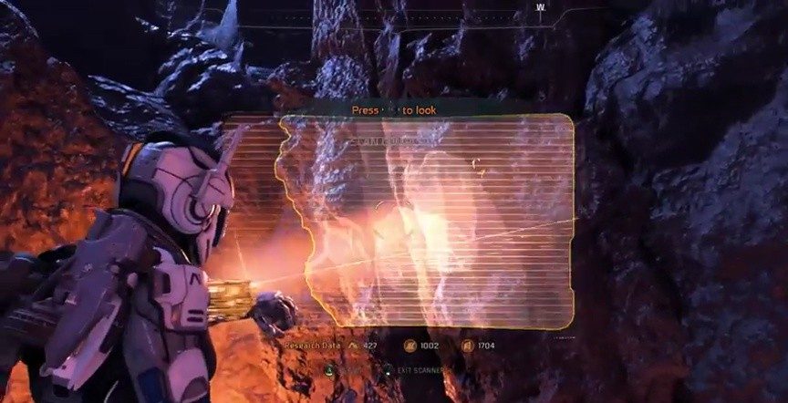 When you get there, you find out what her secret project was. The “secret project” apparently is to find some remaining Remnant tech and to analyze how they find certain objects or figure out how they work. From the pod, make a slight left until you spot a large pool of lava and a tunnel. With that, keep heading north before scanning a Brittle Obsidian for some Research points. Next blow up the Obsidian to find a control panel. Activate the control panel and a door will drop down on your left. Head through the tunnel and follow the pathway while scanning some objects for Research points.
