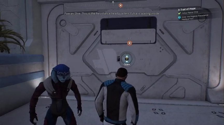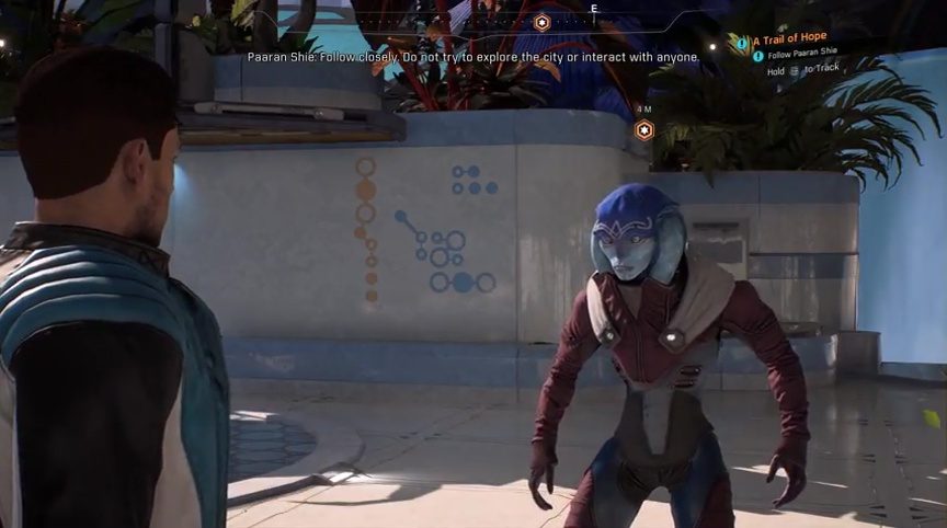 After examining you for a bit, Jaal goes off to inform Evfra. You’ll have to go to the office of the Resistance to meet up with him. He’ll be waiting for you there. Jaal says he’ll be waiting for you as well in the office. Now that you have a meeting with the head honcho, Paaran Shie will serve as your city escort throughout the city in Aya.