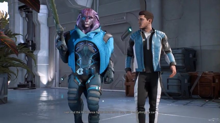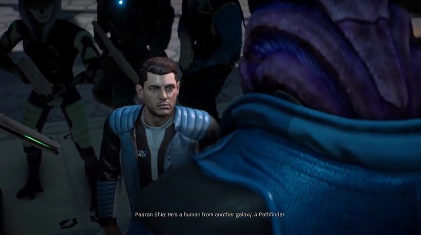 Apparently, Paaran Shie knows that you’re the Pathfinder. Suddenly, another familiar face shows up. An Angara named Jaal. Apparently, some guy named Evfra sent Jaal to find out what’s going on. With that, Paaran explains to Jaal that you’re a human from another galaxy. Someone known as the Pathfinder.