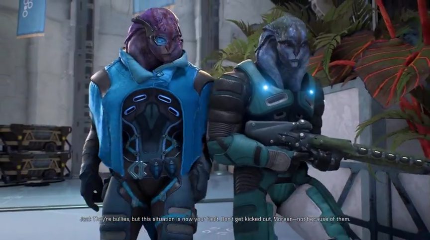 Once you get inside, you see Jaal chiding another Angara named Moraan. However, the latter doesn’t understand only for Jaal to reassure him that he wants him to be strong in cunning and heart. This alleviates Moraan’s distress and gives him a bit of hope. With that, he returns the gun to Jaal before heading out. Before he heads out however, Moraan gives you a deathly stare and then leaves.
