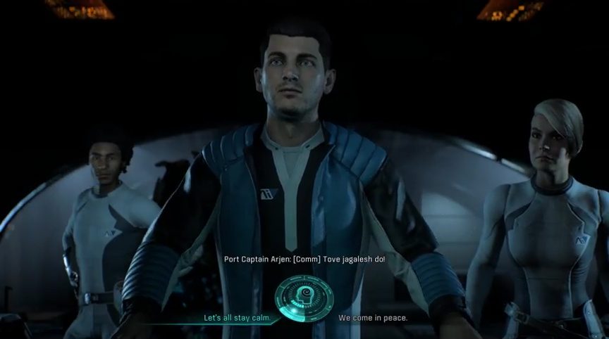 Upon heading back inside, the rest of the crew is eager to find out what happened. Unfortunately, they didn’t get very much as they weren’t allowed to explore. While Liam says that the first contact improved, Drack and Peebee aren’t too happy with it. Vetra asks if Jaal‘s translator works and he says it does.