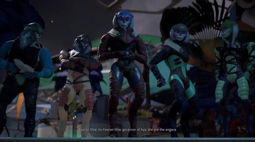 You continue walking until you come across another group of the local alien inhabitants. As you approach the group, you find out that you’re standing in front of Paaran Shie, the governor of the Angara in Aya. So, yes, you finally come across the Angara. They’re one of the few races that were debuted for this game. And you also find out as well that you’re on the planet Aya. At least you know where the hell you are now.