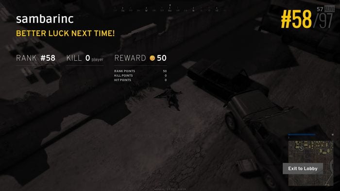 I blame lag for every problem I had in my first session. I literally could not even find a great spot to land. I do also blame myself for not being brave enough to enter the first neighborhood I found just because there were other dudes lurking around it–I have to overcome this. Also, my problem earlier was that I did not reload, because when I finally got to a decent house after cutting through a small patch of trees, I was killed by another wanderer that I heard in the area. Yes, the lag was there, but I was also at fault. I could have survived that.