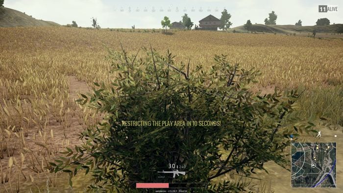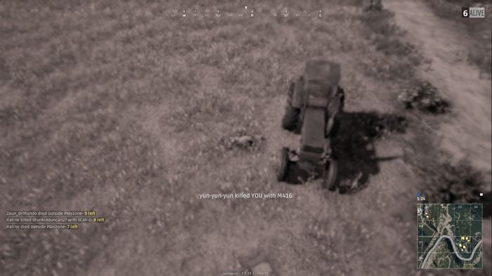 No one was outside. I quickly closed the door, leaving the cabin. Heading up the ditch, I had found myself in the middle of a massive field, with the blue field about fifty meters away. At this point I was already around the top ten, and I heard gunfire that constantly meant we were slowly being picked off by each other, one by one. Like a fool I attempted to use my typical bush-to-bush method to make sure I was not seen, but I guess it didn’t work. The first shot grazed my skin, forcing me to head to the nearest cover–a tractor. I tried hiding and making sure I knew the location of the gun fire, but a bullet killed me before I had any chance.