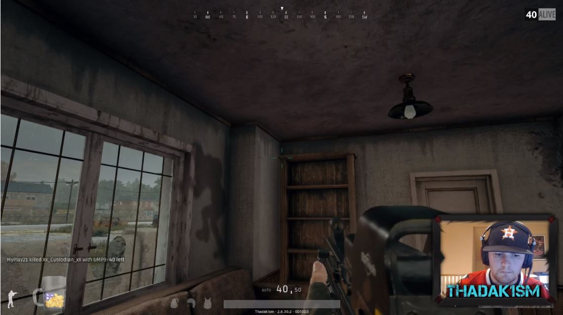 Thadak1sm enters a lone house. The player switches to a submachine gun inside for close encounters. He heads for the living room, then sees a shadow of a player hiding in the attic seemingly through the ceiling. Aiming through the rails of the staircase, he shoots at the other player from the first floor.
