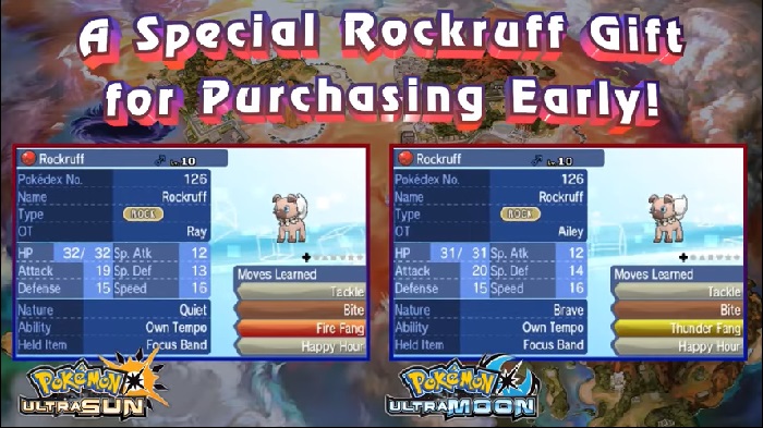 According to the Official Pokemon Youtube Channel, the trailer shows a glimpse of the possible names for the main protagonists. One example is through the reveal of the event exclusive Rockruff. Upon inspection, it is likely that Ray is the male trainer, and Ailey is the female counterpart. This makes sense because Ray which is the OT for the Rockruff on the Sun Version takes elements from previous games. Ray in this case may allude to the Sun’s “Rays.” Similar to the debut of the Female protagonist in Leaf Green, despite lacking an appearance in the anime’s Advance generation, the community decided to stick with Leaf.