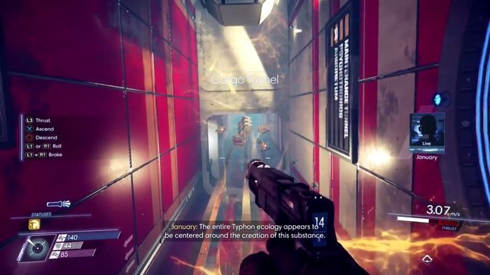 Head back to the Maintenance tunnel to face the cargo tunnel door. Release the lock using the keycard to find a bunch of golden substances decorating the tunnel. Tread as you normally would as they are harmless.