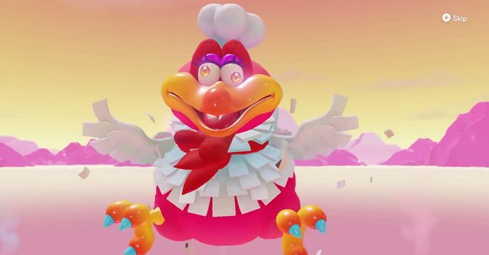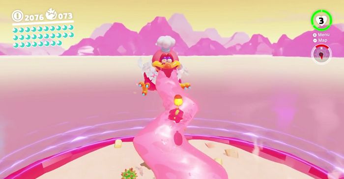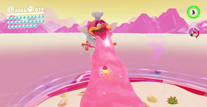 While in Lava Bubble form, Mario encounters this boss roosting on the peak of Mount Volbono. As soon as the boss battle starts, the bird launches piles of bell peppers and prickly fruit to which Mario must dodge by taking cover behind the softer mounds of food.