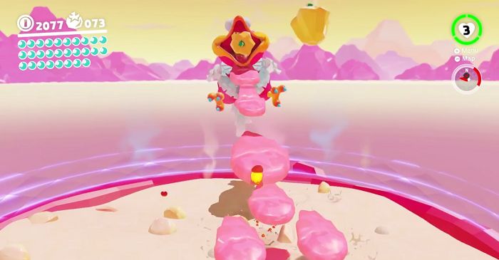 After a round of projectiles, it follows up with a bridge of lava barf. Mario must leap on top of the stacks while avoiding the occasional thorny fruits to inflict damage. Once Mario returns to the ground, the boss continues to toss an even greater barrage of food. Do the same tactic to dodge these hazards, then ascend the zigzag barf path with some fancy footwork.