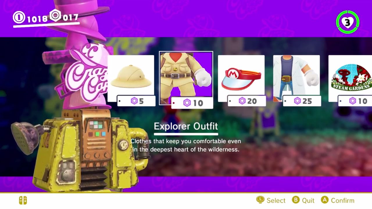 | Explorer Outfit | 10 Purple Coins | Fossil Falls, Cascade Kingdom Steam Gardens, Wooded Kingdom |