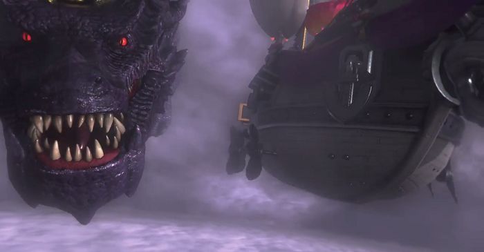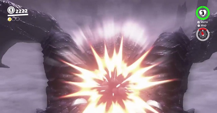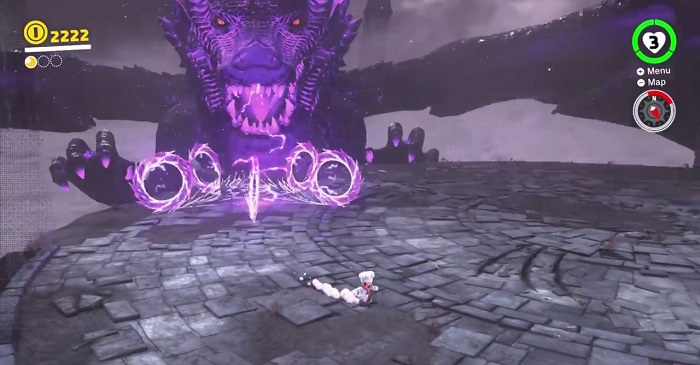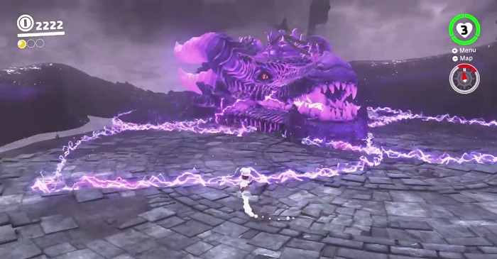 Super Mario Odyssey Lord of Lightning aka the Ruined Dragon is a massive dragon with dark purple covering and lavender horns protruding on both sides of the head. Unlike other dragons in the game, its appearance is more realistic. It serves as the Ruined Kingdom’s guardian.