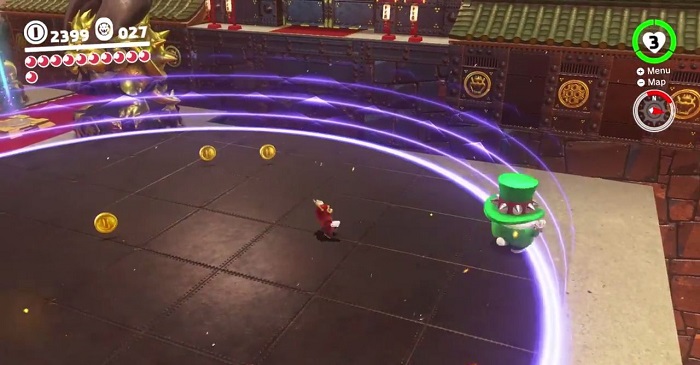 Try to pin the lone hat to a corner and throw Cappy multiple times in quick succession to remove his stack of hats. Stomp on his exposed head to deal damage. Topper continues by forming another barrier of hats that will scatter across different directions. Take them out again one by one until the real hat remains.